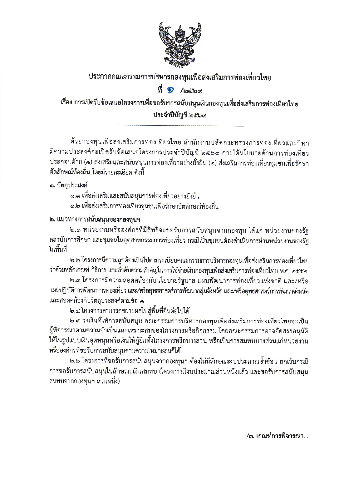 กองทุนเพื่อส่งเสริมการท่องเที่ยวไทยเปิดรับการสนับสนุนงบประมาณ ประจำปีงบประมาณ พ.ศ. 2569 โดยมีกำหนดเปิดรับข้อเสนอโครงการระหว่างวันที่ 8 มกราคม - 22 กุมภาพันธ์ 2569